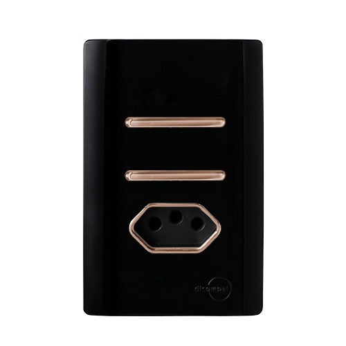ANUNCIO CONTÉM: 1. CJ INTERRUPTOR (1SIMPLES+1PARALELO)+TOMADA 10A COM SUPORTE 4X2 -DICOMPEL NOVARA PRETO C/ OURO ROSE - DNV1700/25PBOR OU SEJA: 1. PLACA P/ 2 INTERRUPTORES + TOMADA COM SUPORTE 4X2 - DICOMPEL NOVARA PRETO BRILHANTE - DNV1700/79PB 1. MODULO INTERRUPTOR SIMPLES - DICOMPEL NOVARA OURO ROSE - DNV1500/257OR 1. MODULO INTERRUPTOR PARALELO - DICOMPEL NOVARA OURO ROSE - DNV1500/258OR 1. MODULO TOMADA 10A - DICOMPEL NOVARA PRETO BRILHANTE C/ OURO ROSE - DNV1700/274PBOR DETALHES DO PRODUTO: Com um design fantástico, minimalista e de fácil instalação a DICOMPEL inovou no mercado de tomadas e interruptores modulares. A linha novara conta com uma pintura cromada automotiva, assim não descasca e nem perde sua cor. Seus interruptores, pulsadores, conjugados e tomadas dão 5 anos de garantia. SEMPRE TEM UMA NOVARA QUE COMBINA COM O QUE VOCÊ DESEJA;