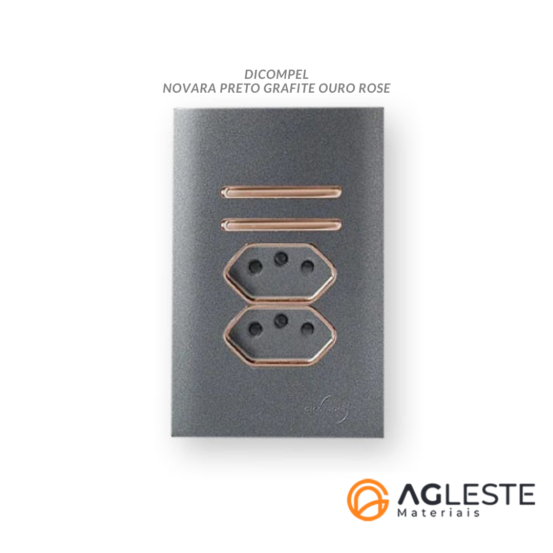 ANUNCIO CONTÉM: 1. CJ INTERRUPTOR DUPLO PARALELO + TOMADA DUPLA 10A (ESPECIAL) 4X2 - NOVARA PRETO GRAFITE C/ OURO ROSE - DNV1600/179PGOR OU SEJA: 1. PLACA P/ 2 INTERRUPTORES + 2 TOMADAS COM SUPORTE (ESPECIAL) 4X2 - DICOMPEL NOVARA PRETO GRAFITE - DNV1600/192PG 2.MODULO TOMADA 10A - DICOMPEL NOVARA PRETO GRAFITE C/ OURO ROSE - DNV1600/286PGOR 1. MODULO INTERRUPTOR DUPLO PARALELO ( ESPECIAL ) - DICOMPEL NOVARA OURO ROSE/ OURO ROSE - DNV1500/261OROR DETALHES DO PRODUTO: Com um design fantástico, minimalista e de fácil instalação a DICOMPEL inovou no mercado de tomadas e interruptores modulares. A linha novara conta com uma pintura cromada automotiva, assim não descasca e nem perde sua cor. Seus interruptores, pulsadores, conjugados e tomadas dão 5 anos de garantia. SEMPRE TEM UMA NOVARA QUE COMBINA COM O QUE VOCÊ DESEJA;