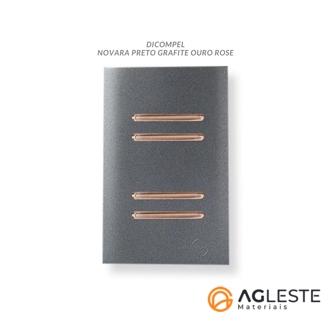 ANUNCIO CONTÉM: 1.CJ QUADRUPLO (2SIMPLES+2PARALELOS) C/ SUPORTE (ESPECIAL) 4X2-DICOMPEL NOVARA PRETO GRAFITE C/ OURO ROSE- DNV1600/174PGOR OU SEJA: 1. PLACA P/ 4 INTERRUPTORES HORIZONTAIS COM SUPORTE (ESPECIAL) 4X2 - DICOMPEL NOVARA PRETO GRAFITE - DNV1600/190PG 1. MODULO INTERRUPTOR DUPLO SIMPLES ( ESPECIAL ) - DICOMPEL NOVARA OURO ROSE/ OURO ROSE - DNV1500/260OROR 1. MODULO INTERRUPTOR DUPLO PARALELO ( ESPECIAL ) - DICOMPEL NOVARA OURO ROSE/ OURO ROSE - DNV1500/261OROR DETALHES DO PRODUTO: Com um design fantástico, minimalista e de fácil instalação a DICOMPEL inovou no mercado de tomadas e interruptores modulares. A linha novara conta com uma pintura cromada automotiva, assim não descasca e nem perde sua cor. Seus interruptores, pulsadores, conjugados e tomadas dão 5 anos de garantia. SEMPRE TEM UMA NOVARA QUE COMBINA COM O QUE VOCÊ DESEJA;