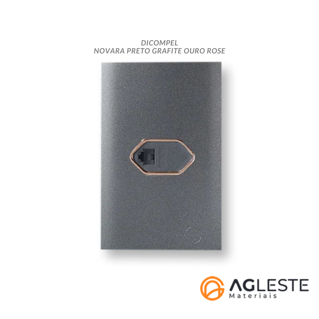 ANUNCIO CONTÉM: 1. CJ ENTRADA RJ11 ( TELEFONE ) COM SUPORTE 4X2 - DICOMPEL NOVARA PRETO GRAFITE C/ OURO ROSE - DNV1600/39PGOR OU SEJA: 1. PLACA P/ 1 TOMADA HORIZONTAL COM SUPORTE 4X2 - DICOMPEL NOVARA PRETO GRAFITE - DNV1600/67PG 1. MODULO ENTRADA RJ11 (TELEFONE) - DICOMPEL NOVARA PRETO GRAFITE C/ OURO ROSE - DNV1600/280PGOR DETALHES DO PRODUTO: Com um design fantástico, minimalista e de fácil instalação a DICOMPEL inovou no mercado de tomadas e interruptores modulares. A linha novara conta com uma pintura cromada automotiva, assim não descasca e nem perde sua cor. Seus interruptores, pulsadores, conjugados e tomadas dão 5 anos de garantia. SEMPRE TEM UMA NOVARA QUE COMBINA COM O QUE VOCÊ DESEJA;