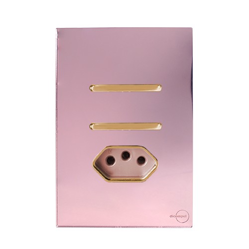 ANUNCIO CONTÉM: 1. CJ INTERRUPTOR DUPLO PARALELO + TOMADA 20A COM SUPORTE 4X2 - DICOMPEL NOVARA GLASS OURO ROSE GOLD - DNG1500/27ORGD OU SEJA: 1. PLACA P/ 2 INTERRUPTORES + TOMADA COM SUPORTE 4X2 - DICOMPEL NOVARA GLASS OURO ROSE - DNGO-40000/10 2. MODULO INTERRUPTOR PARALELO - DICOMPEL NOVARA CROMADO - DNV1200/35CR 1. MODULO TOMADA 20A - DICOMPEL OURO ROSE C/ CROMADO - DNV1500/71ORCR DETALHES DO PRODUTO: Com um design fantástico, minimalista e de fácil instalação a DICOMPEL inovou no mercado de tomadas e interruptores modulares. A linha novara conta com uma pintura cromada automotiva, assim não descasca e nem perde sua cor. Seus interruptores, pulsadores, conjugados e tomadas dão 5 anos de garantia. SEMPRE TEM UMA NOVARA QUE COMBINA COM O QUE VOCÊ DESEJA;