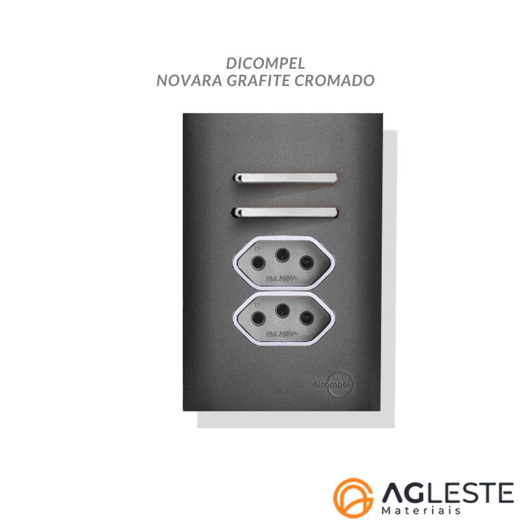 ANUNCIO CONTÉM: 1 . CJ DUPLO (SIMPLES+PARALELO) + TOMADA DUPLA 10A (ESPECIAL) 4X2 - DICOMPEL NOVARA PRETO GRAFITE CROMADO - DNV1600/182PGCR OU SEJA: 1 . PLACA P/ 2 INTERRUPTORES + 2 TOMADAS COM SUPORTE (ESPECIAL) 4X2 - DICOMPEL NOVARA PRETO GRAFITE - DNV1600/192PG 2. MODULO TOMADA 10A - DICOMPEL NOVARA GRAFITE CROMADO - DNV1600/70GFCR 1 . MODULO INTERRUPTOR DUPLO (1 SIMPLES + 1 PARALELO) ESPECIAL - DICOMPEL NOVARA CROMADO - DNV1200/76CR DETALHES DO PRODUTO: Com um design fantástico, minimalista e de fácil instalação a DICOMPEL inovou no mercado de tomadas e interruptores modulares. A linha novara conta com uma pintura cromada automotiva, assim não descasca e nem perde sua cor. Seus interruptores, pulsadores, conjugados e tomadas dão 5 anos de garantia. SEMPRE TEM UMA NOVARA QUE COMBINA COM O QUE VOCÊ DESEJA;