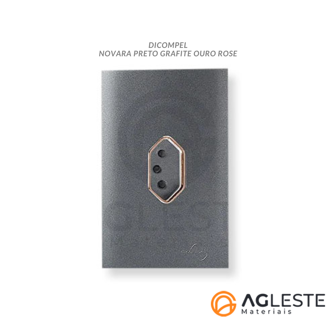 ANUNCIO CONTÉM: 1. CJ TOMADA 10A VERTICAL COM SUPORTE 4X2 - DICOMPEL NOVARA PRETO GRAFITE C/ OURO ROSE - DNV1600/12PGOR OU SEJA: 1. PLACA P/ 1 TOMADA VERTICAL COM SUPORTE 4X2 - DICOMPEL NOVARA PRETO GRAFITE - DNV1600/66PG 1. MODULO TOMADA 10A - DICOMPEL NOVARA PRETO GRAFITE C/ OURO ROSE - DNV1600/286PGOR DETALHES DO PRODUTO: Com um design fantástico, minimalista e de fácil instalação a DICOMPEL inovou no mercado de tomadas e interruptores modulares. A linha novara conta com uma pintura cromada automotiva, assim não descasca e nem perde sua cor. Seus interruptores, pulsadores, conjugados e tomadas dão 5 anos de garantia. SEMPRE TEM UMA NOVARA QUE COMBINA COM O QUE VOCÊ DESEJA;