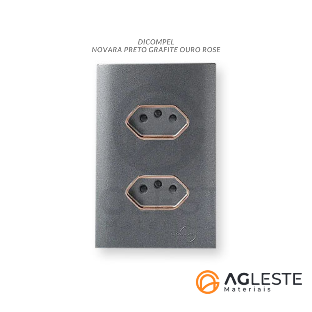 ANUNCIO CONTÉM: 1. CJ TOMADA DUPLA 10A COM SUPORTE 4X2 - DICOMPEL NOVARA PRETO GRAFITE C/ OURO ROSE - DNV1600/32PGOR OU SEJA: 1. PLACA P/ 2 TOMADAS COM SUPORTE 4X2 - DICOMPEL NOVARA PRETO GRAFITE - DNV1600/68PG 2. MODULO TOMADA 10A - DICOMPEL NOVARA PRETO GRAFITE C/ OURO ROSE - DNV1600/286PGOR DETALHES DO PRODUTO: Com um design fantástico, minimalista e de fácil instalação a DICOMPEL inovou no mercado de tomadas e interruptores modulares. A linha novara conta com uma pintura cromada automotiva, assim não descasca e nem perde sua cor. Seus interruptores, pulsadores, conjugados e tomadas dão 5 anos de garantia. SEMPRE TEM UMA NOVARA QUE COMBINA COM O QUE VOCÊ DESEJA;