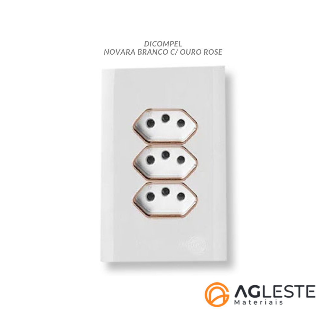 ANUNCIO CONTÉM: 1 - CJ TOMADA TRIPLA 20A COM SUPORTE 4X2 - DICOMPEL NOVARA BRANCO C/ OURO ROSE - DNV1200/151BROR OU SEJA: 3 - MODULO TOMADA 20A - DICOMPEL NOVARA BRANCO C/ OURO ROSE - DNV1500/275BROR 1 -PLACA P/ 3 TOMADAS COM SUPORTE 4X2 - DICOMPEL NOVARA BRANCO - DNV1200/149BR DETALHES DO PRODUTO: Com um design fantástico, minimalista e de fácil instalação a DICOMPEL inovou no mercado de tomadas e interruptores modulares. A linha novara conta com uma pintura cromada automotiva, assim não descasca e nem perde sua cor. Seus interruptores, pulsadores, conjugados e tomadas dão 5 anos de garantia. SEMPRE TEM UMA NOVARA QUE COMBINA COM O QUE VOCÊ DESEJA;