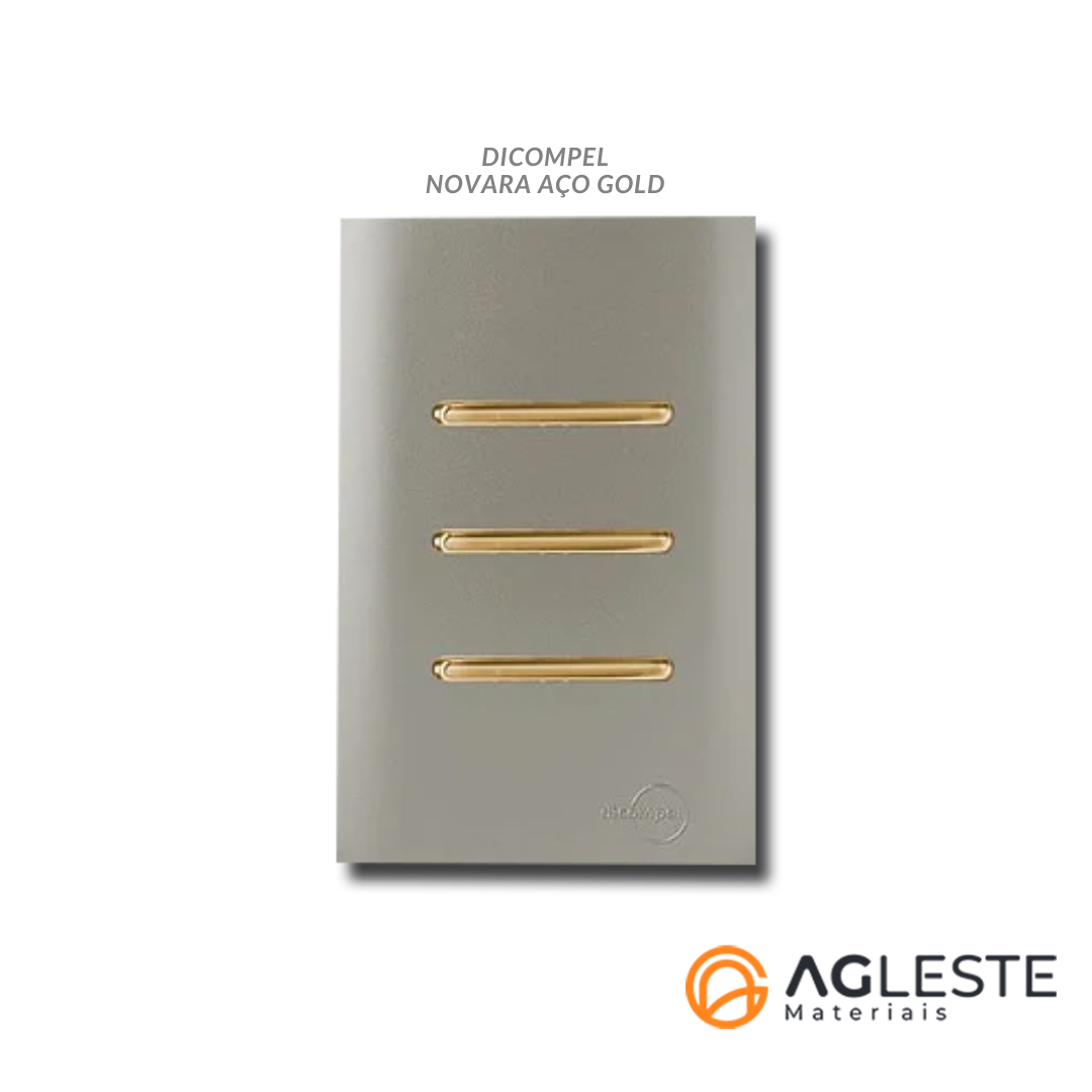 ANUNCIO CONTÉM: 1. CJ INTERRUPTOR TRIPLO PARALELO COM SUPORTE 4X2 - DICOMPEL NOVARA AÇO GOLD - DNV1500/9ACGD OU SEJA: 1. PLACA P/ 3 INTERRUPTORES COM SUPORTE 4X2 - DICOMPEL NOVARA AÇO - DNV1500/65AC 3. MODULO INTERRUPTOR PARALELO - DICOMPEL NOVARA GOLD - DNV1200/158GD DETALHES DO PRODUTO: Com um design fantástico, minimalista e de fácil instalação a DICOMPEL inovou no mercado de tomadas e interruptores modulares. A linha novara conta com uma pintura cromada automotiva, assim não descasca e nem perde sua cor. Seus interruptores, pulsadores, conjugados e tomadas dão 5 anos de garantia. SEMPRE TEM UMA NOVARA QUE COMBINA COM O QUE VOCÊ DESEJA; Normal 0 21 false false false PT-BR X-NONE X-NONE